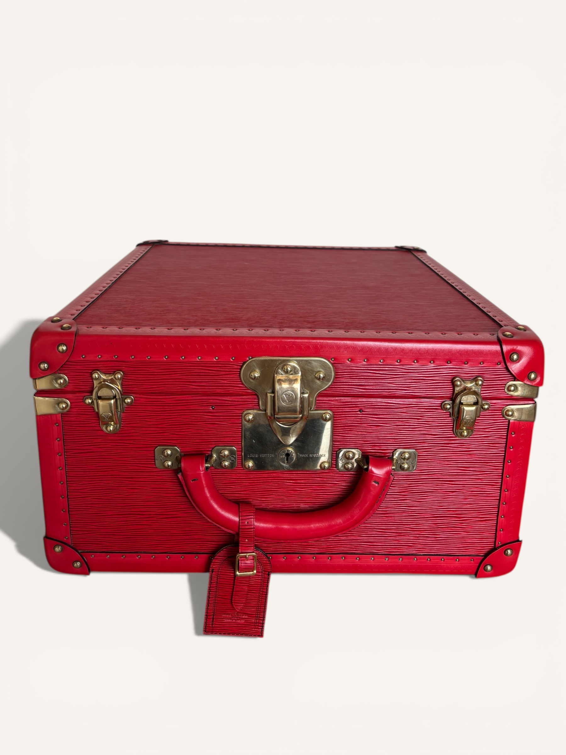 Cette valise Louis Vuitton Coteville en cuir Épi rouge, datée des années 70–80, en très bon état, avec intérieur en alcantara gris et clé d’origine, est une pièce iconique de la bagagerie Louis Vuitton. Un choix idéal pour les amateurs de voyage de luxe vintage et de pièces de collection authentiques.